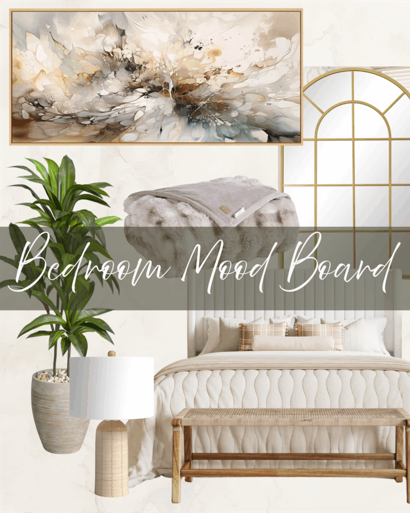 If I could describe my ideal bedroom in three words, it would be warm, soft, and serene. This mood board captures that perfect balance between cozy comfort and modern sophistication. From the plush quilted bedding and natural wood bench to the statement wall art and gold-accented mirror, each piece brings texture and light into the space.