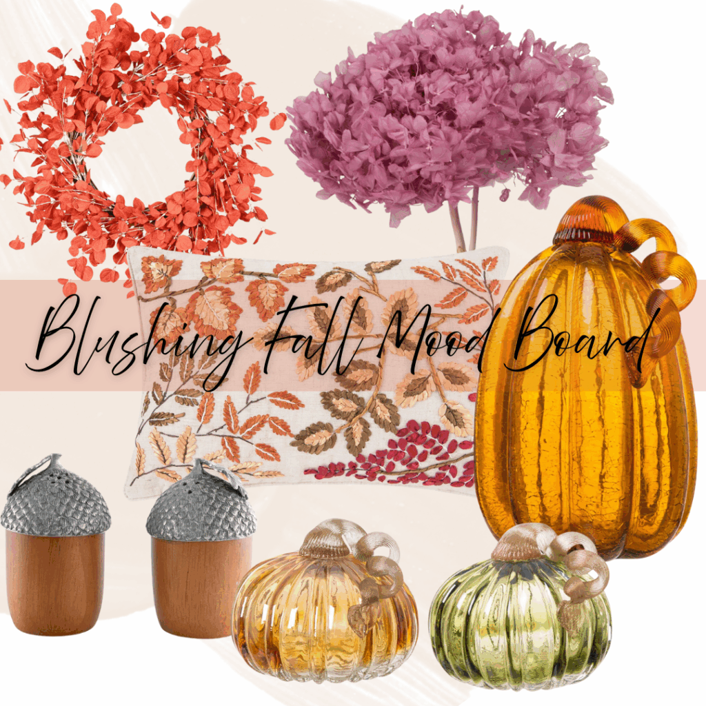 This year, my first year (haha), my fall mood board leans into warmth and light. Amber glass gourds, rose-tinted florals, and soft leafy patterns that make my space feel cozy but not too “pumpkin patch chic.” Think: golden-hour glow meets a floral daydream.